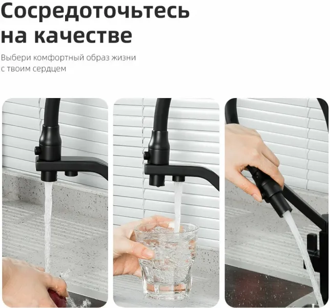 Смеситель для кухни Gappo G4317-6 со встроенным фильтром под питьевую воду чёрный
