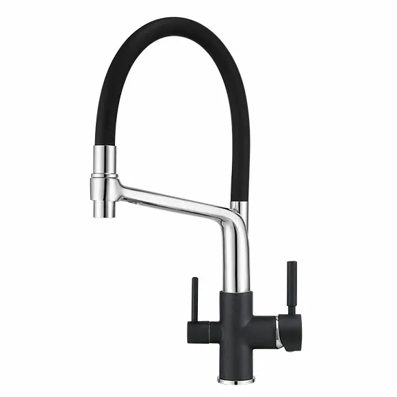 Смеситель для кухонной мойки Granula 0083 изготовлен из высококачественного материала. Латунный корпус обеспечивает длительный срок службы. При этом высокий излив с гибким шлангом позволяет мыть как мелкую, так и крупногабаритную посуду. Двухрычажная модель смесителя Granula 0083 выполнена с краном для питьевой воды. Фильтрованная вода подается по отдельной трубке и не смешивается с водопроводной водой.