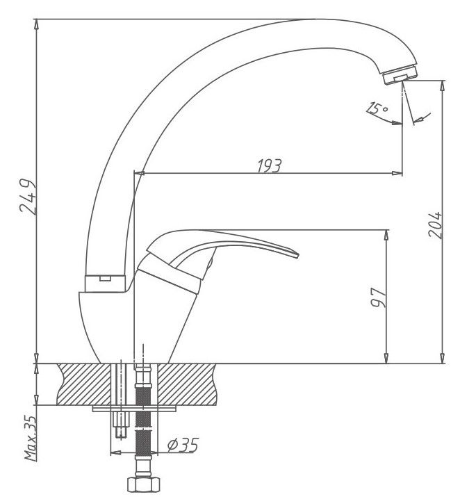 Смеситель для кухни бренда Haiba.Изготовлен из латуни.Картридж 40 мм.Укомплектован аэратором.Гибкая подводка 40 см.С поворотным изливом.