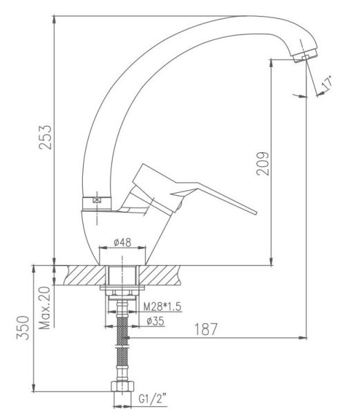 Смеситель для кухни бренда Haiba.Изготовлен из латуни.Картридж 40 мм.Укомплектован аэратором.Гибкая подводка 40 см.С поворотным изливом.