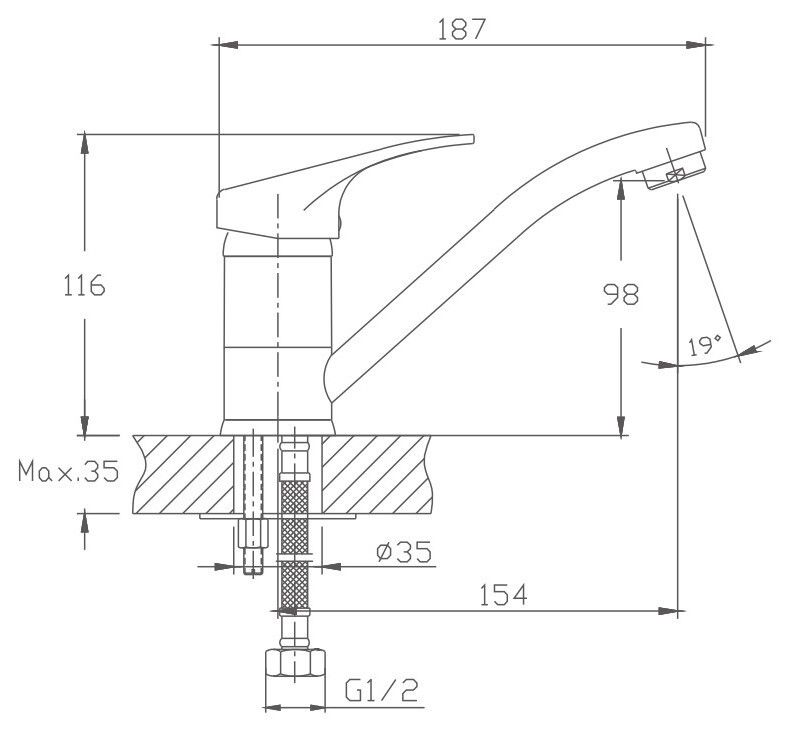 Смеситель для кухни бренда Haiba.Изготовлен из латуни.Картридж 35 мм.Укомплектован аэратором.Гибкая подводка 40 см.С поворотным изливом.