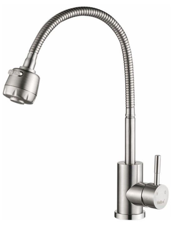 Смеситель для кухни бренда Haiba.Изготовлен из нержавеющей стали.Картридж 35 мм.Укомплектован аэратором.Гибкая подводка 40 см.С поворотным изливом.