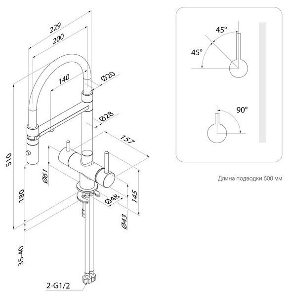 2 ручки: для включения фильтрованной воды и обычной водопроводной (угол открывания ручки – 90 градусов, на себя; может отличаться в зависимости от партии). Фильтр в комплекте не идет и приобретается отдельно.