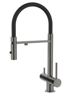 Профессиональный смеситель для кухни Ace в цвете графит с черным гибким изливом и отдельным каналом для фильтрованной воды. Продуманный и функциональный, он успешно справляется с повседневными задачами на кухне.