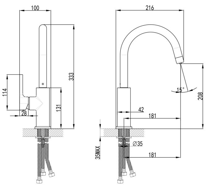 • Высота смесителя: