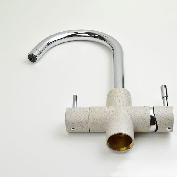 Оптимизируем мокрую зону на кухне со смесителем PAINI COX на 3 воды! Однорычажный смеситель классической формы, но с одной важной деталью: фильтр для воды подключается прямо к смесителю. Легкий монтаж без дополнительных отверстий в столешнице, теперь для доступа к питьевой воде нужно просто повернуть рычаг на корпусе смесителя. Смеситель представлен в необычных цветах, что дает простор творчеству и позволяет сочетать его с мойками и кухонной мебелью разных фактур и материалов.Разнообразие цветаТри варианта бежевого цвета: сахара, бежевый с вкраплениями (гранит) и нежный трюфель, а также белый с вкраплениями (гранит) и комбинация черного и хромого цветов в корпусе смесителя. Теперь точно получится попасть в цвет столешницы и/или цвет мойки либо создать контрастные сочетания. Все варианты покрытия, включая покрытие под камень, выполнены по специальной технологии, сохраняющей цвет и фактуру надолго и облегчающей уход за смесителем.3 воды в одном корпусеПодключение фильтра для воды прямо к смесителю.Европейское качествоСделано в Италии. Гарантия – 5 лет.Технологии гарантируют долгий срок службыФабрика «Паини» использует только лучшие комплектующие. Аэратор Neoperl наполняет поток воды кислородом, увеличивает напор, экономя воду. Одно движение пальцем для очистки сеточки. Керамический картридж Nuovo Galatron – основа, необходимая для долгой работы смесителя.Легкая уборкаНесколько движений – и готово. Мыльная губка и сухая тряпочка – все, что нужно для уборки.