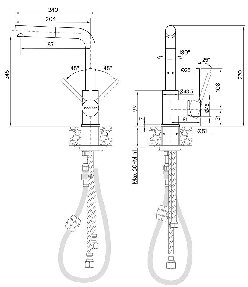 Смеситель для кухни с выдвижным шлангом, Ka214311-308.Изготовлен из высококачественной латуни, которая отвечает высочайшим европейским стандартам качества, не содержит свинца, не разрушается со временем и безопасна для здоровья.Вытяжной шланг