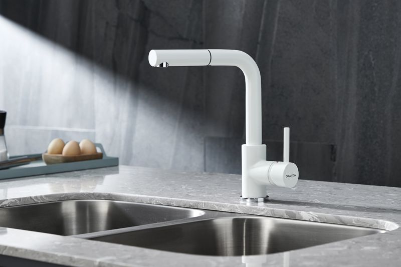 Смеситель для кухни с выдвижным шлангом, Ka214311-431TWИзготовлен из высококачественной латуни, которая отвечает высочайшим европейским стандартам качества, не содержит свинца, не разрушается со временем и безопасна для здоровья.Вытяжной шланг