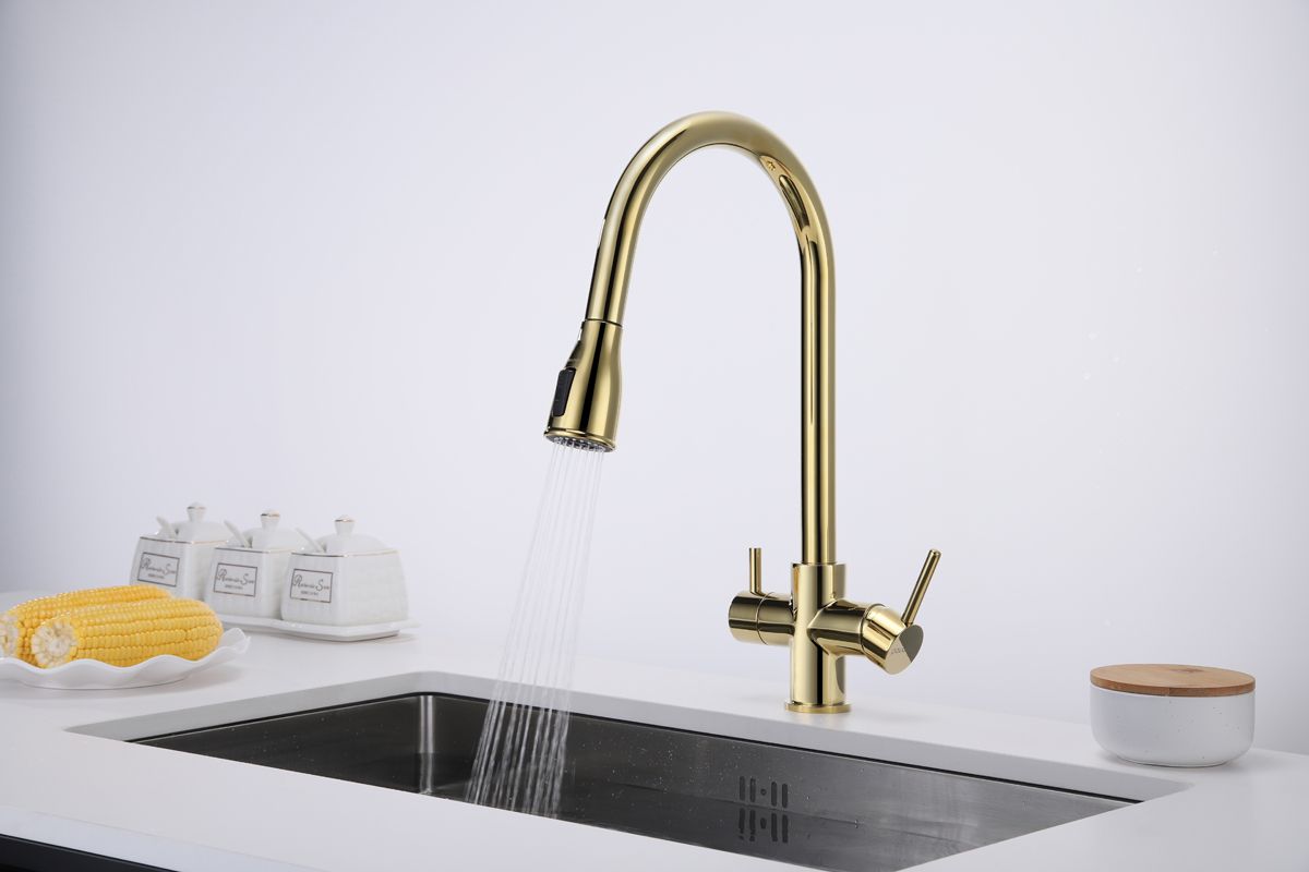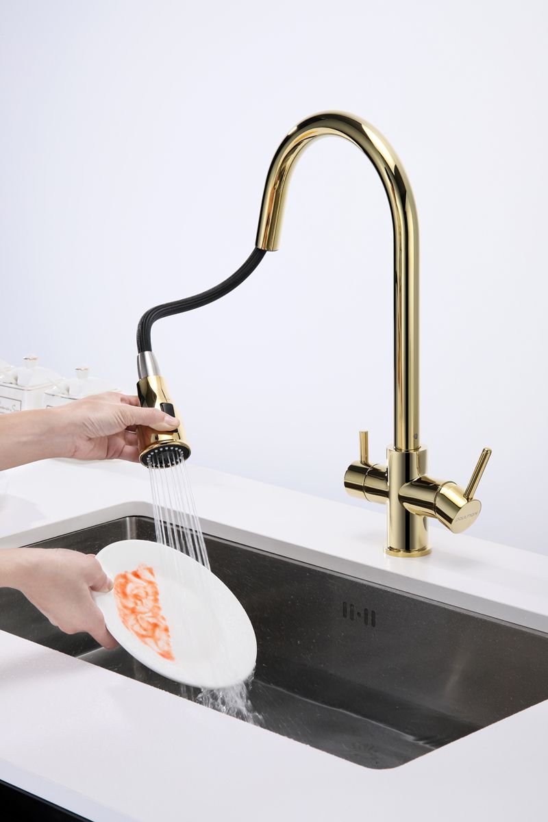 Смеситель под фильтрованную воду с выдвижным шлангом, артикул La214212-GИзготовлен из высококачественной латуни, которая отвечает высочайшим европейским стандартам качества, не содержит свинца, не разрушается со временем и безопасна для здоровья.Вытяжной шланг