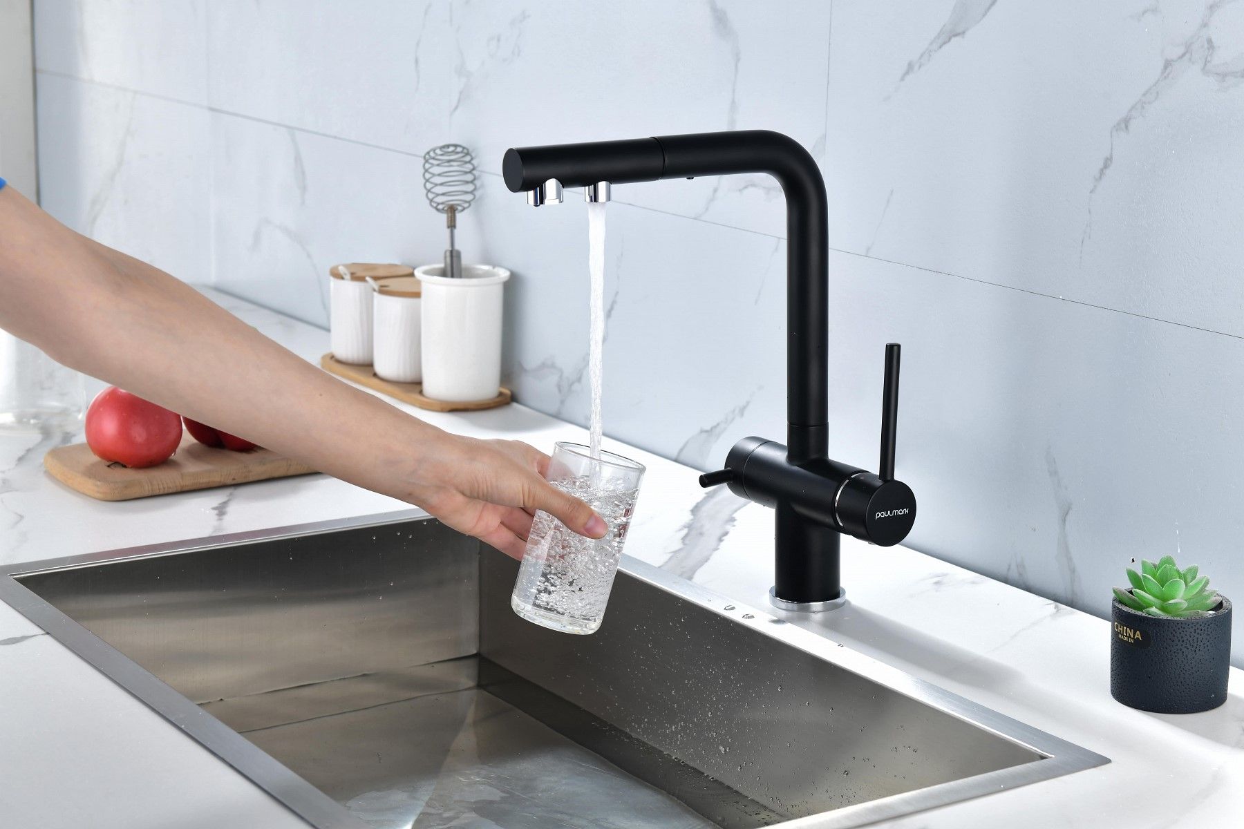 SERPENTINE оснащён функцией TRINKWASSER - излив смесителя имеет встроенный независимый канал для питьевой воды из фильтра, таким образом питьевая и водопроводная вода не смешиваются. Управление питьевой водой осуществляется отдельным рычагом, расположенным слева. Для пуска водопроводной воды используется большой рычаг справа.