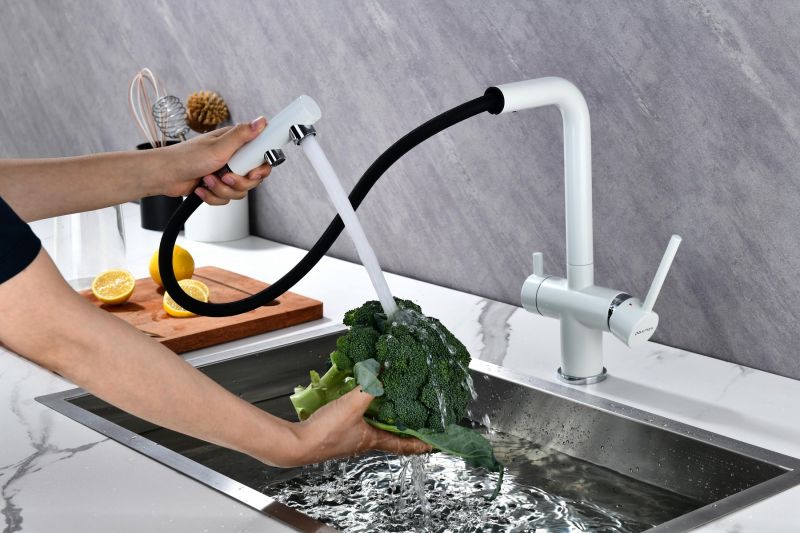 Смеситель оснащен гибким выдвижным изливом из нелойновой оплетки, которая обладает отличной устойчивостью к истиранию и разрушению. Данная техническая особенность расширяет рабочую зону смесителя, позволяя пользоваться им с удобством в больших мойках, мойках с двумя чашами, или наполнять водой ёмкость на столе рядом с мойкой, в том числе питьевой водой.