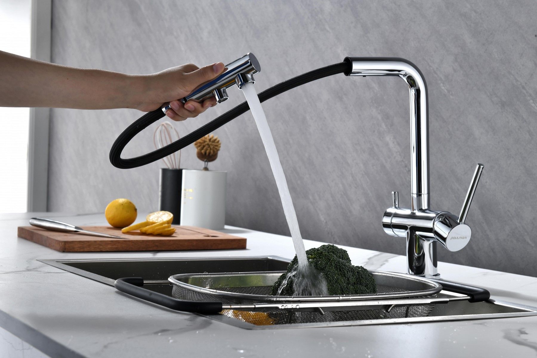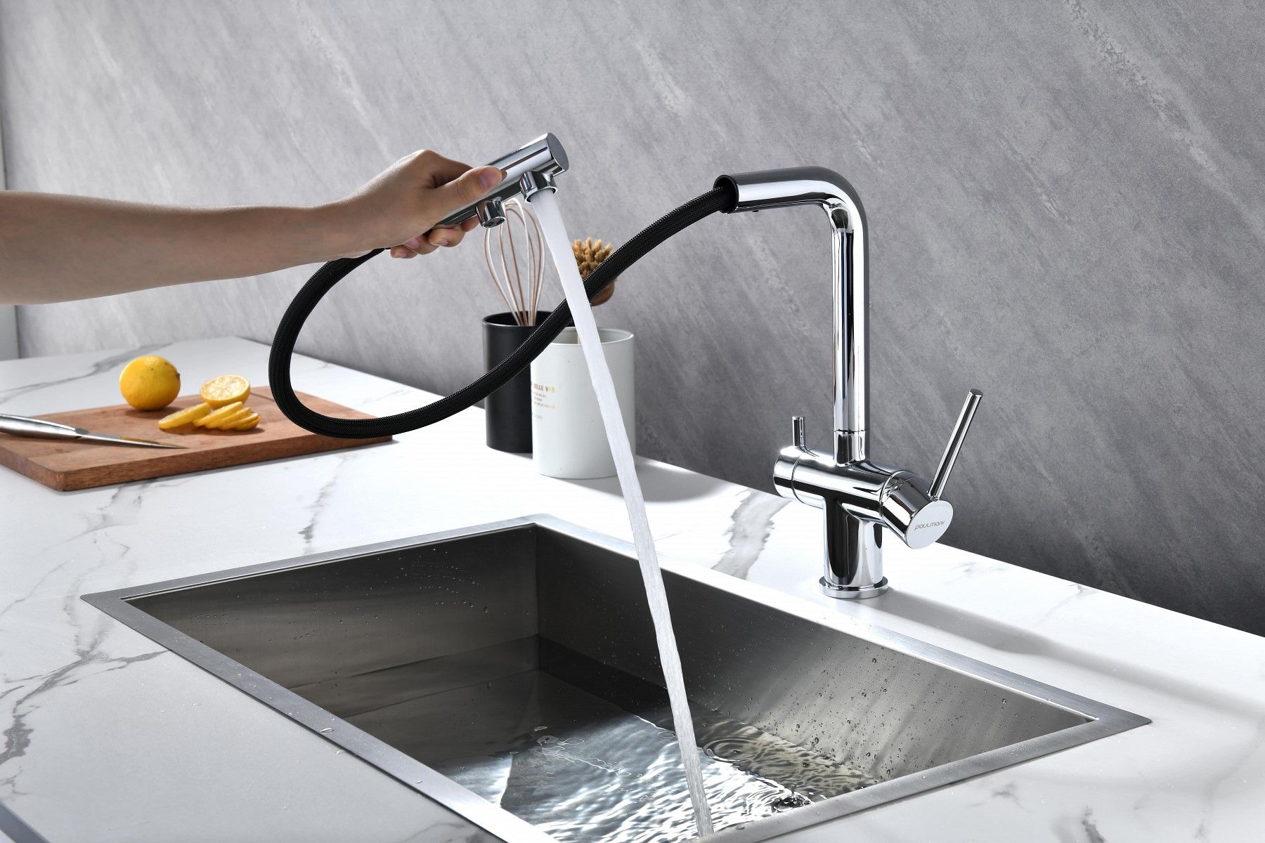 Смеситель оснащен гибким выдвижным изливом из нелойновой оплетки, которая обладает отличной устойчивостью к истиранию и разрушению. Данная техническая особенность расширяет рабочую зону смесителя, позволяя пользоваться им с удобством в больших мойках, мойках с двумя чашами, или наполнять водой ёмкость на столе рядом с мойкой, в том числе питьевой водой.