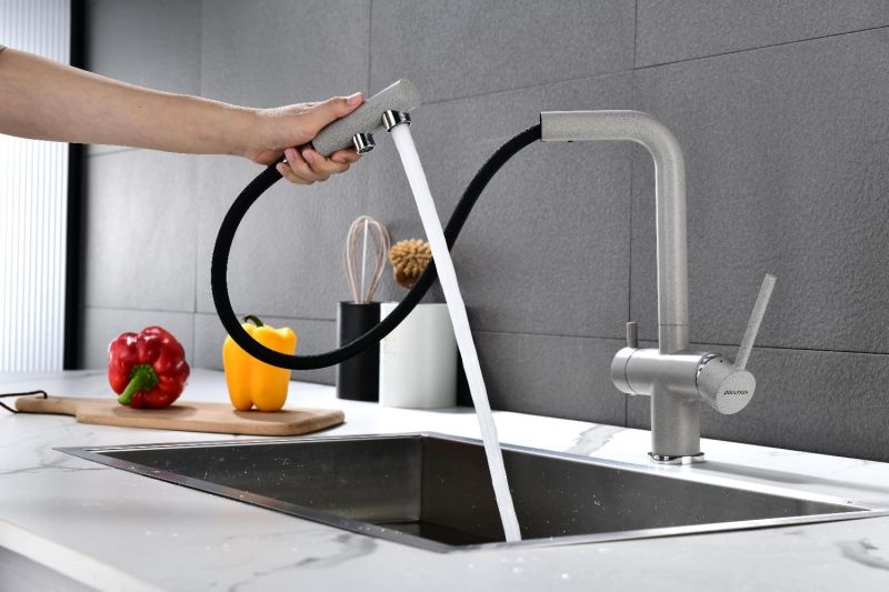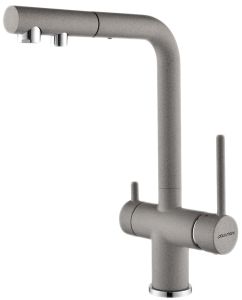 Смеситель для кухни с выдвижным изливом и возможностью подключения фильтра питьевой воды, артикул Se213222-GRИзготовлен из высококачественной латуни, которая отвечает высочайшим европейским стандартам качества, не содержит свинца, не разрушается со временем и безопасна для здоровья.Смеситель для кухонной мойки SERPENTINE изготовлен из высококачественной латуни в классическом дизайне с изливом Г-образной формы. Излив поворотный на 180. Высота излива – 330 мм.