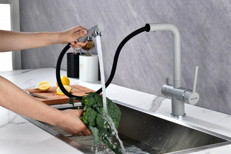 Смеситель для кухни с выдвижным изливом и возможностью подключения фильтра питьевой воды, артикул Se213222-GRSИзготовлен из высококачественной латуни, которая отвечает высочайшим европейским стандартам качества, не содержит свинца, не разрушается со временем и безопасна для здоровья.Смеситель для кухонной мойки SERPENTINE изготовлен из высококачественной латуни в классическом дизайне с изливом Г-образной формы. Излив поворотный на 180. Высота излива – 330 мм.