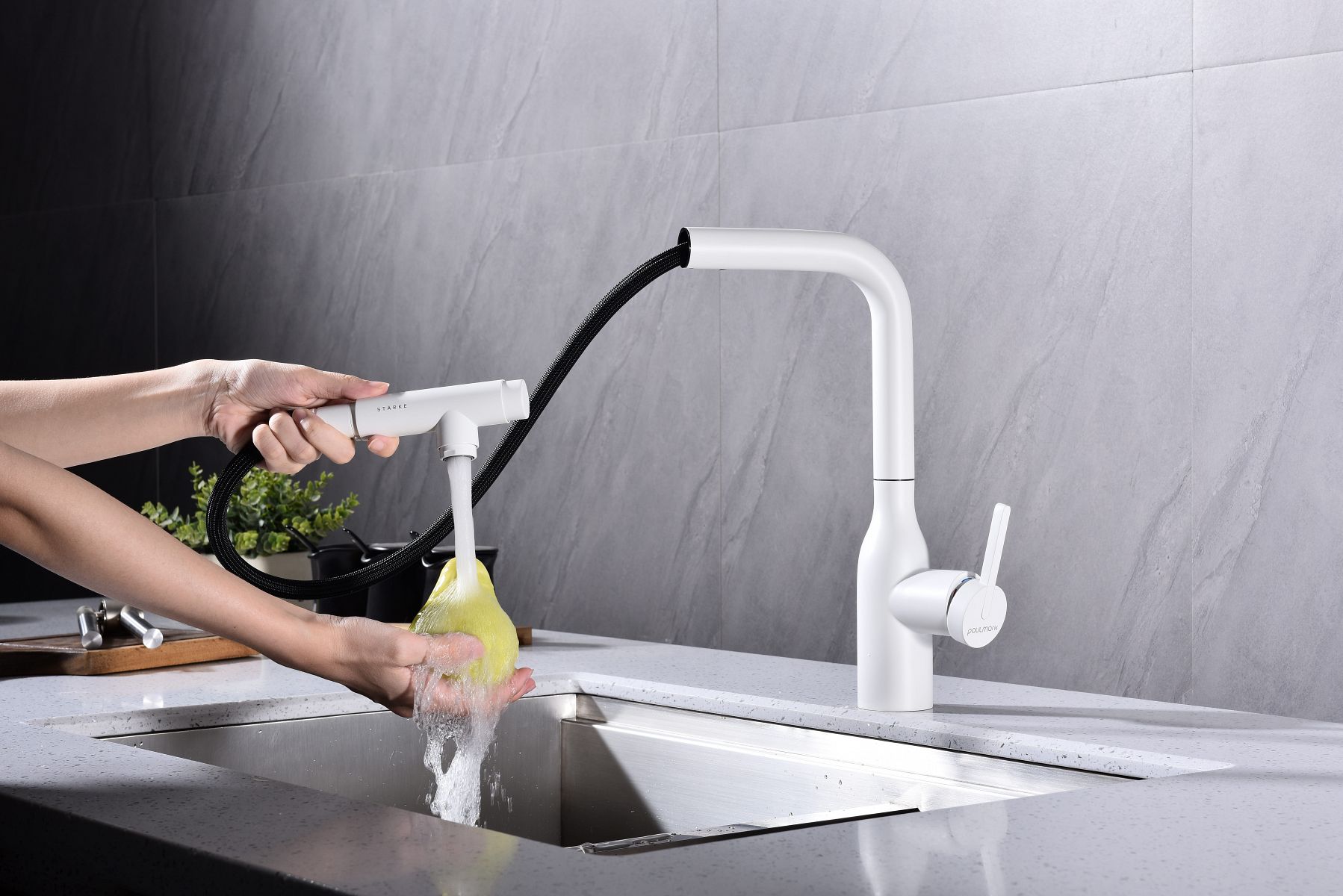 Высокий Г-образный излив с функцией вращения на 360 градусов обеспечивает удобство использования. Выдвижная часть излива способна обеспечить максимально комфортную эксплуатацию и экономный расход воды.