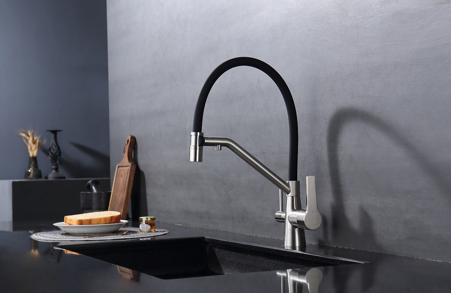 Смеситель для кухни со съемным изливом на магните и подключением фильтра питьевой воды. Гибкий съемный шланг значительно расширяет зону использования смесителя, благодаря этому можно мыть объемную посуду. Модель предназначена для одновременного подключения к водопроводу и фильтру и позволяет снабжать как обычной, так и питьевой водой.