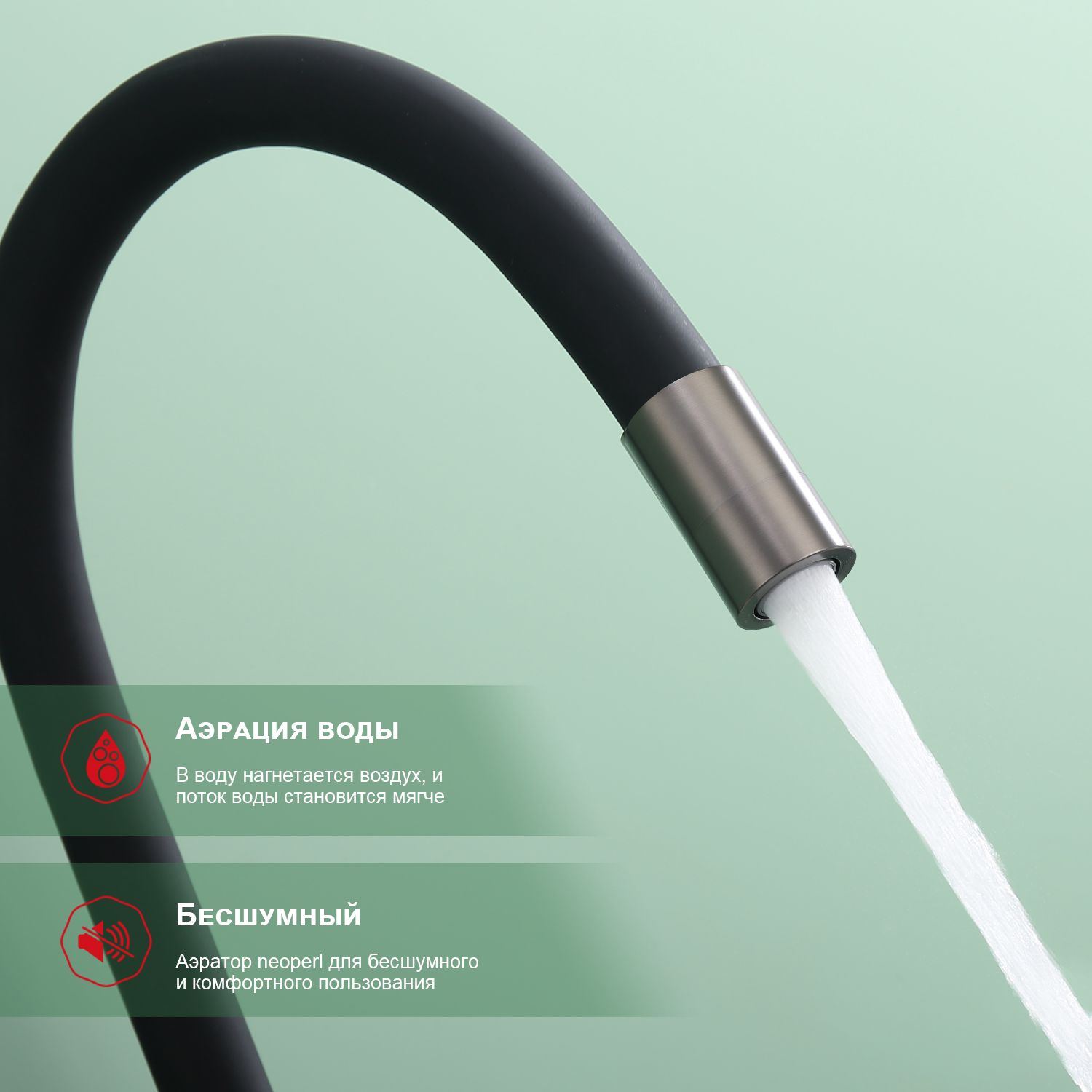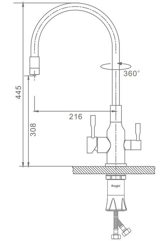 Смеситель для кухни с подключением к фильтру питьевой воды. Гибкий излив белого цвета. Крепление на усиленной гайке. Подводка длиной 55 см имеет латунные гайки. Гарантия на смеситель 7 лет и 2 года на покрытие!