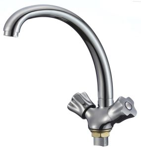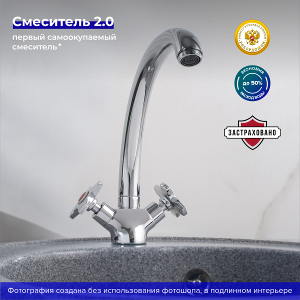 Привлекательный двуручковый смеситель для кухни в классическом исполнении, обладает удобными в использовании ручками регулирования температуры и напора воды.