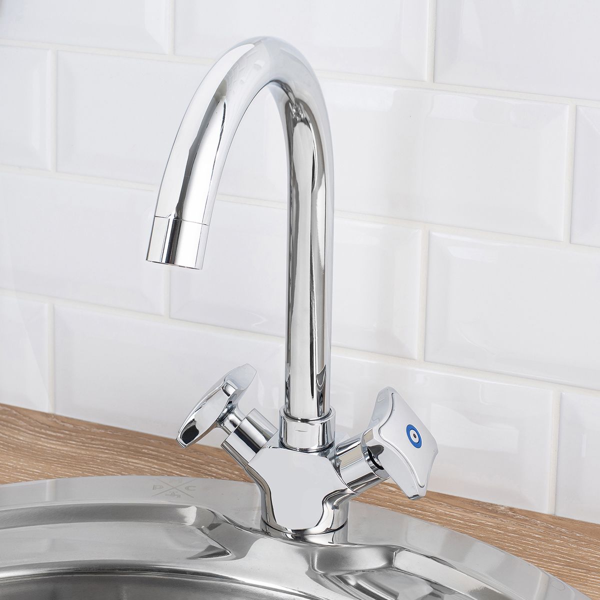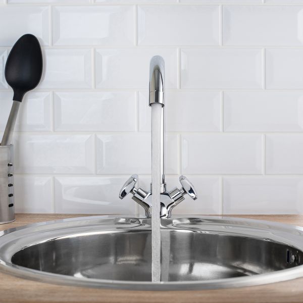 Двуручковый смеситель для кухни с высоким изливом обладает стильными и удобными в использовании ручками регулирования температуры и напора воды.