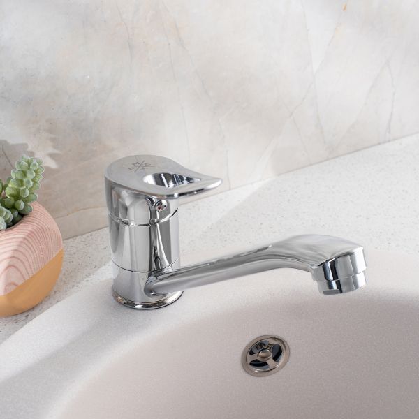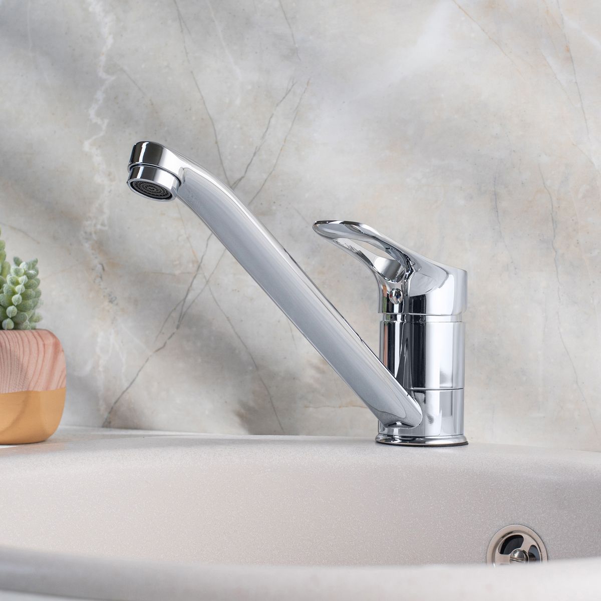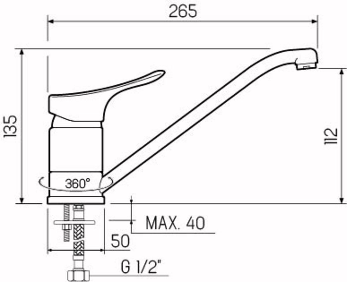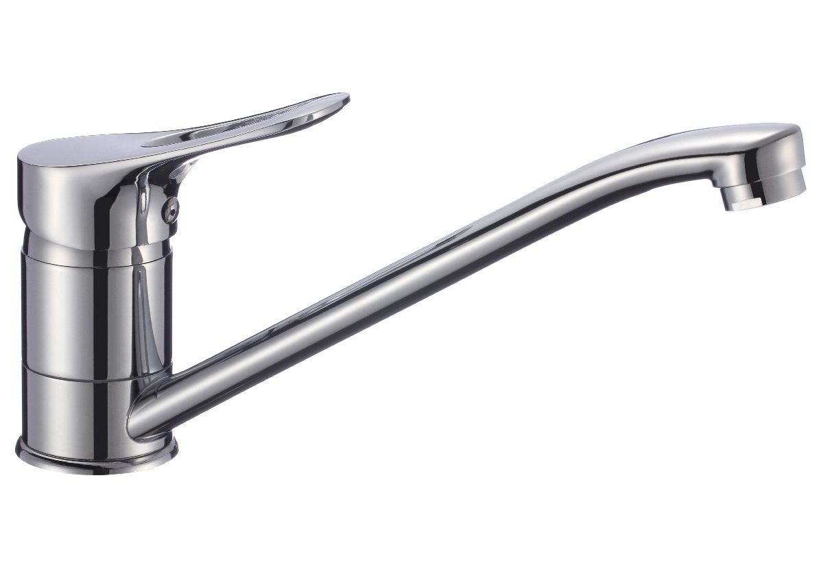 Классический однорычажный смеситель для кухни с длинным поворотным изливом обладает эргономичной ручкой регулировки температуры воды, отлично подойдёт для оснащения стандартной раковины.