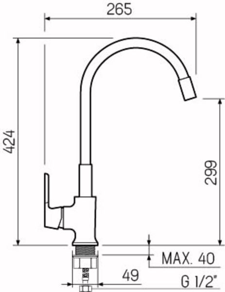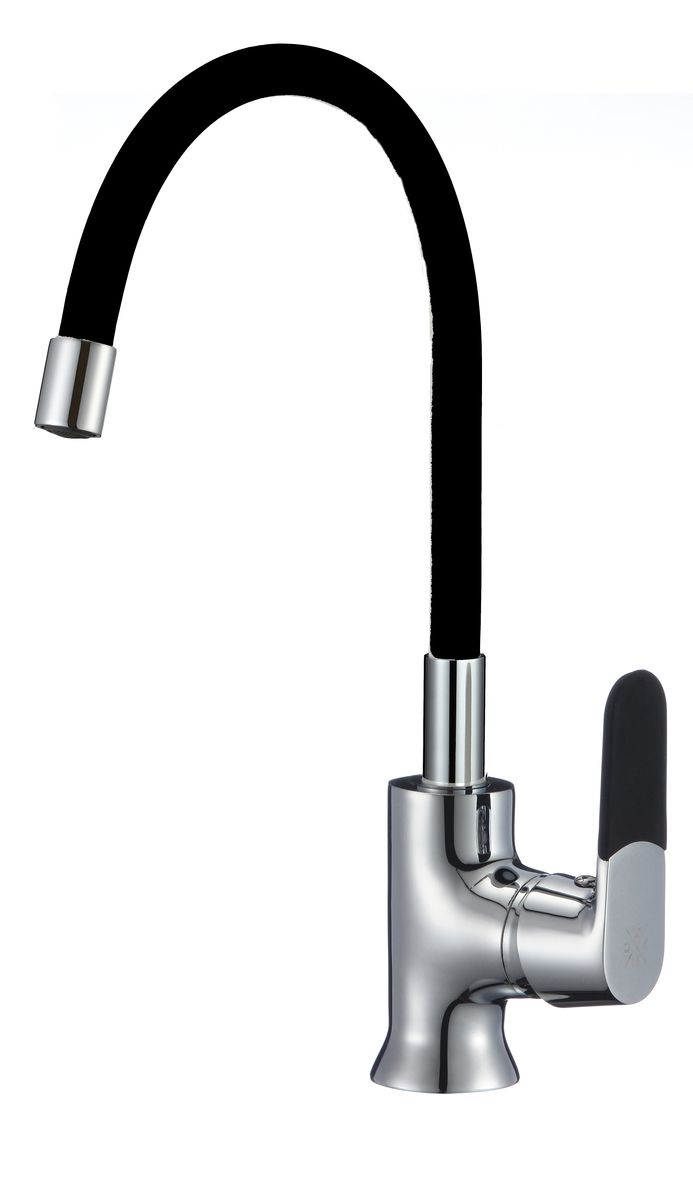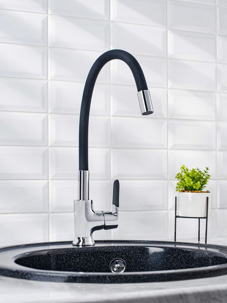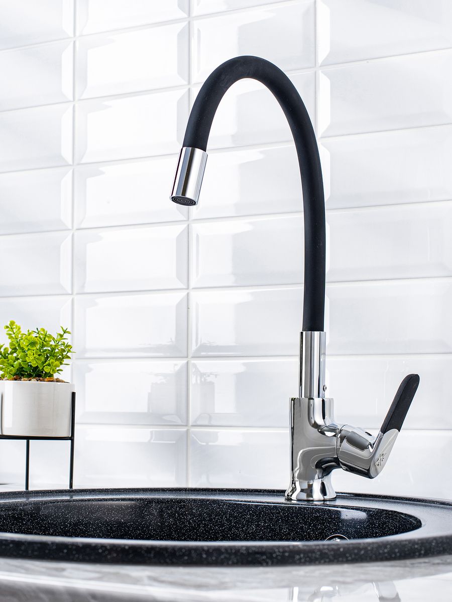 Стильный одноручковый смеситель для кухни с высоким гибким изливом эргономичен в использовании и эффектно подчеркивает итерьер за счет черного оттенка дизайна.