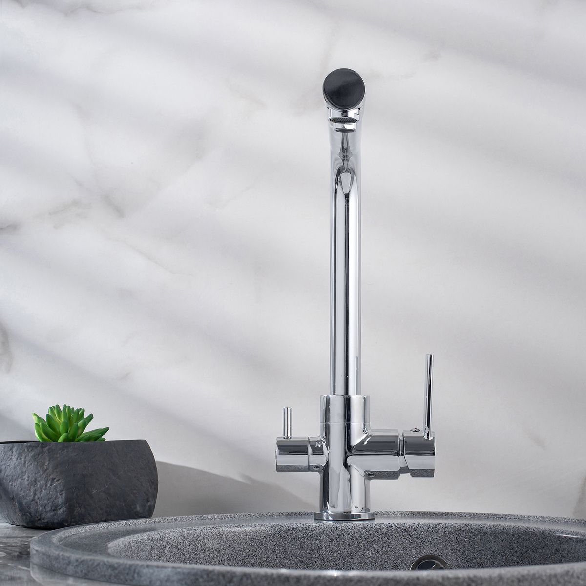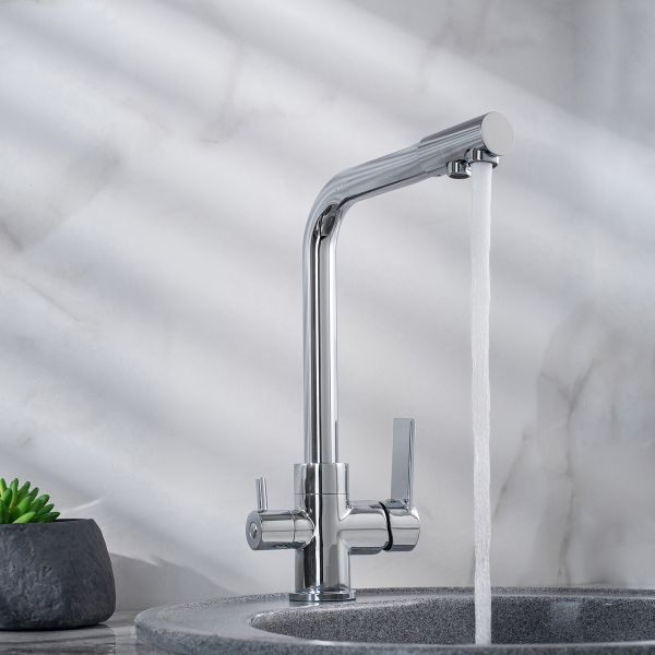 Стильный и лаконичный однорычажный смеситель для кухни с высоким поворотным изливом, прекрасно подойдёт для подключения фильтра питьевой воды благодаря дополнительному изливу и специальному переходнику.
