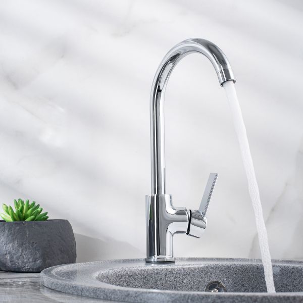 Стильный и лаконичный однорычажный смеситель для кухни с высоким поворотным изливом.