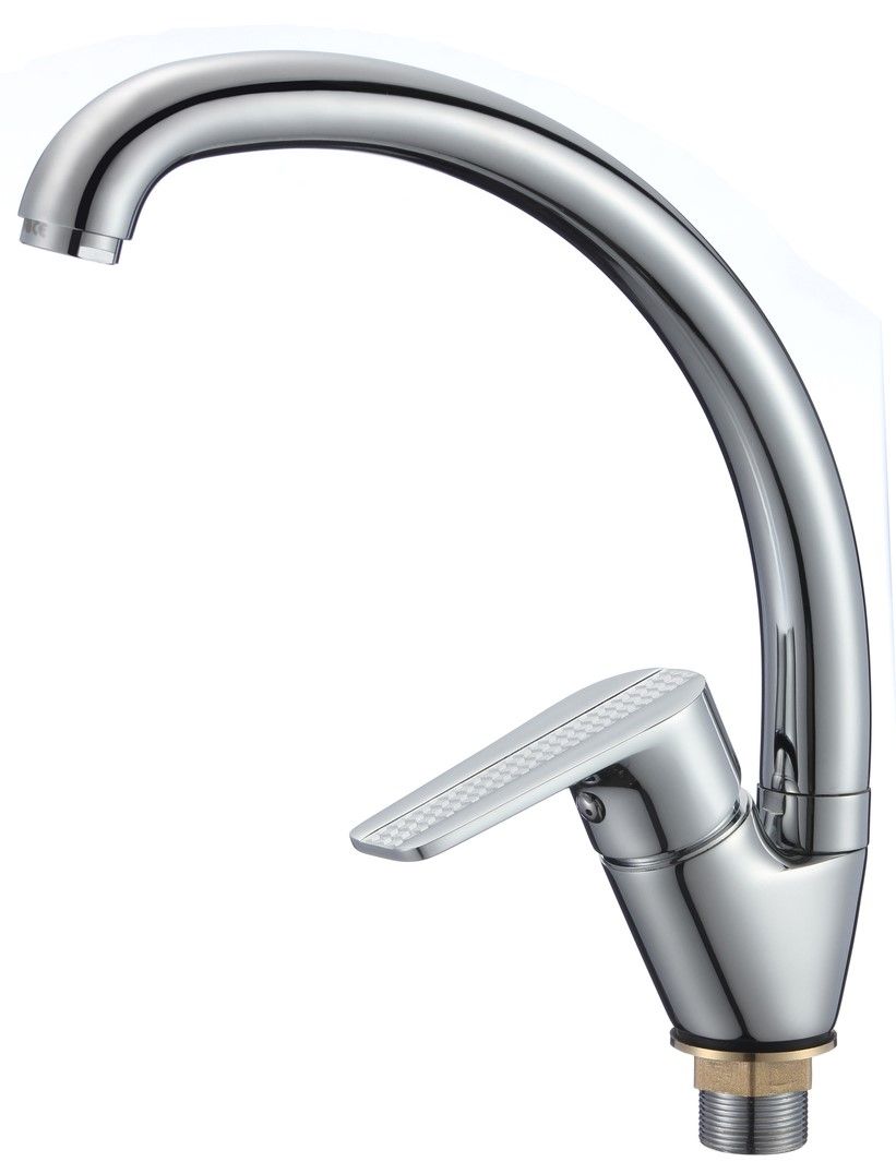Классический однорычажный смеситель для кухни с высоким поворотным изливом, дополнен оригинальным оформлением ручки.