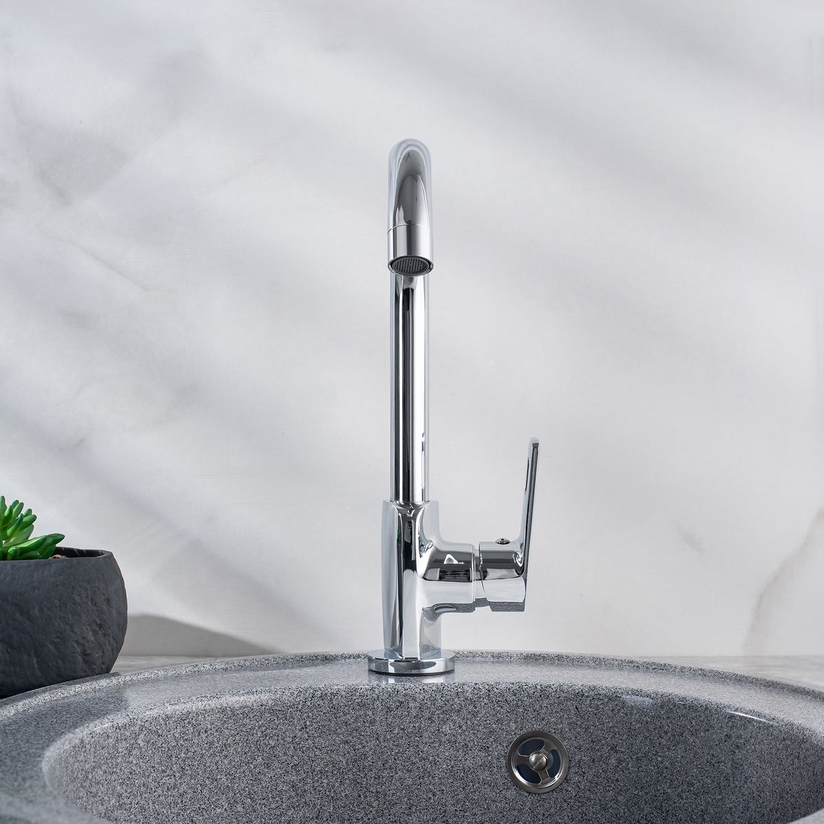 Функциональный однорычажный смеситель для кухни с высоким поворотным изливом станет неотъемлемой частью вашей кухни, а сочетание прямых линий и округлых форм стильно украсит кухонную мойку.