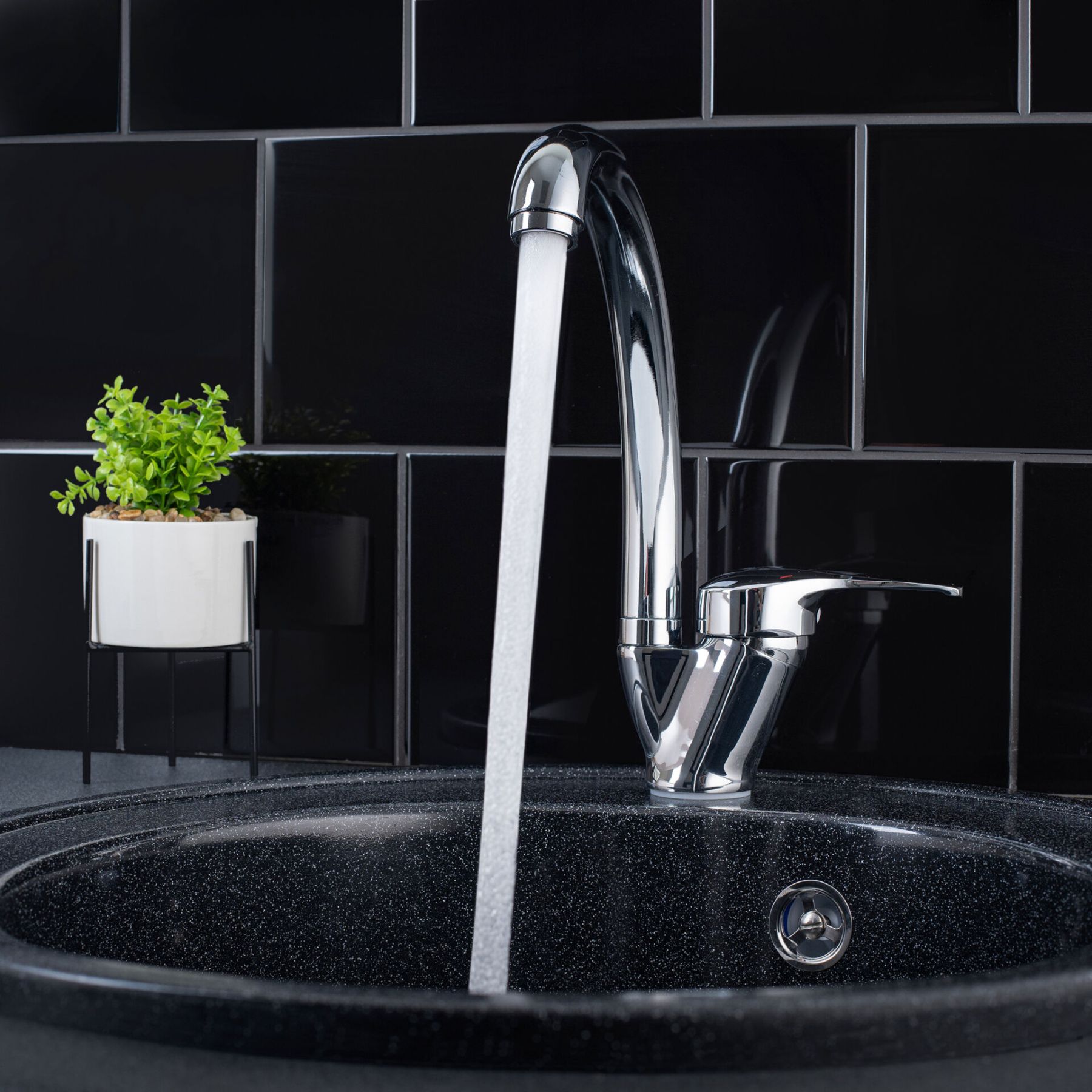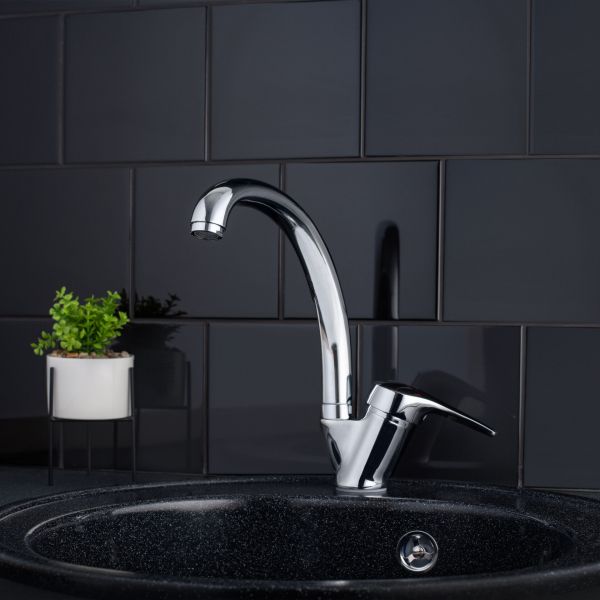 Элегантный одноручковый смеситель для кухни с высоким поворотным изливом станет прекрасным интерьерным решением и функциональным помощником на любой кухне.