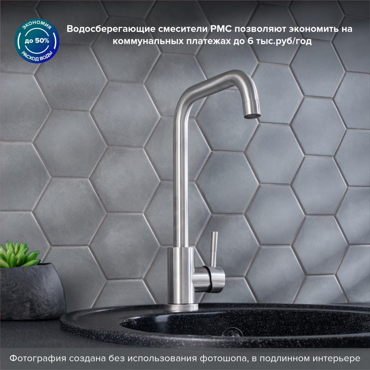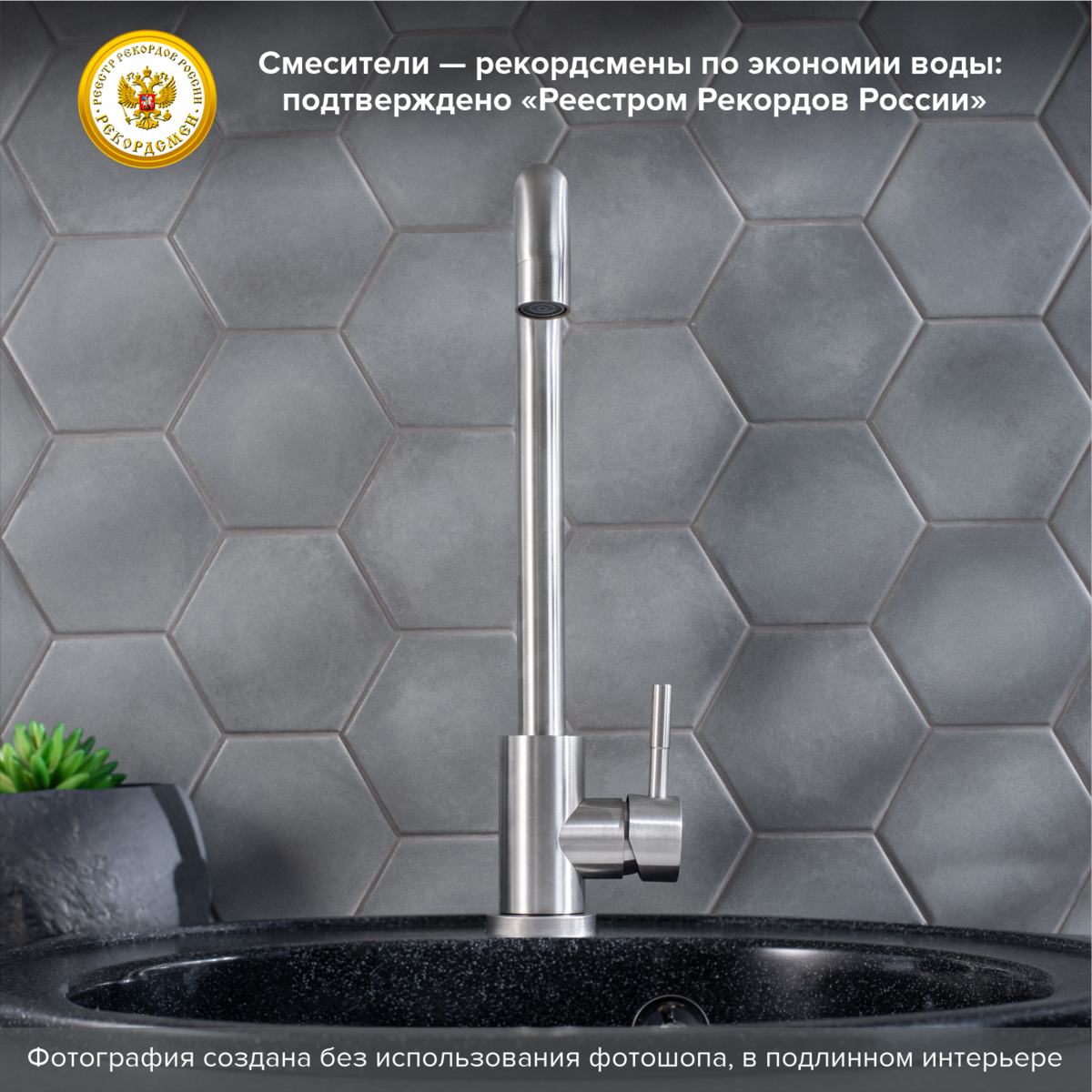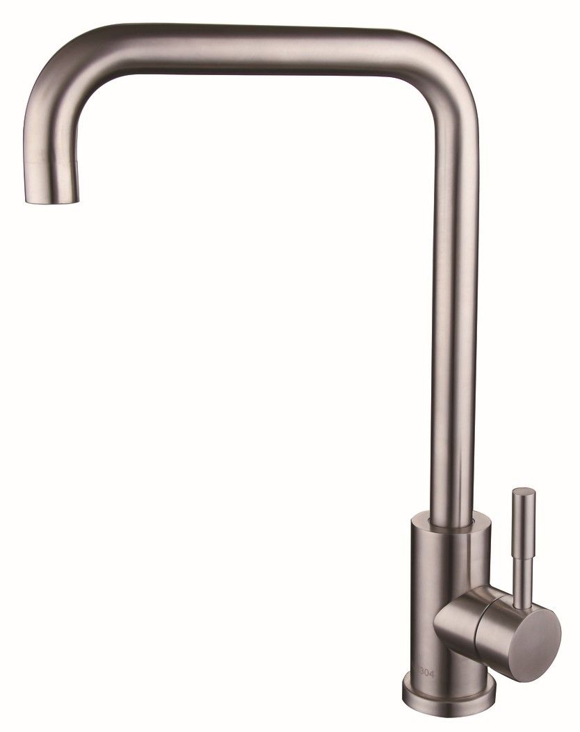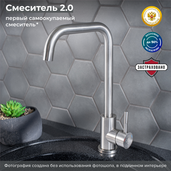 Оригинальный одноручковый смеситель для кухни из нержавеющей стали с высоким изливом прекрасно подойдет для мойки любого размера.
