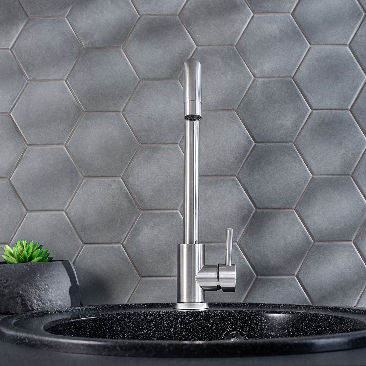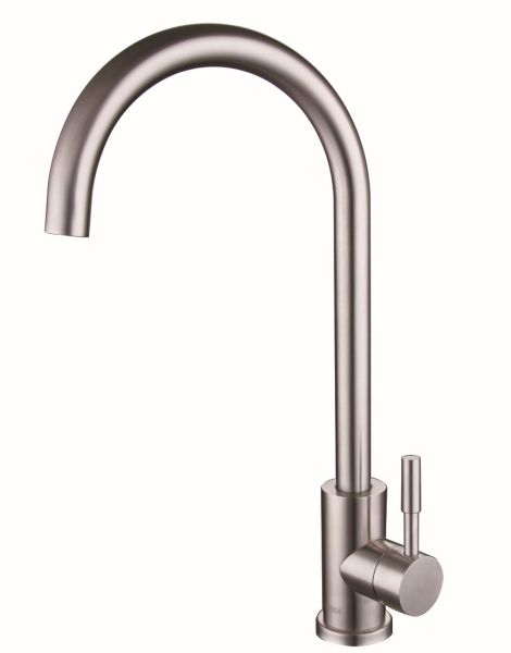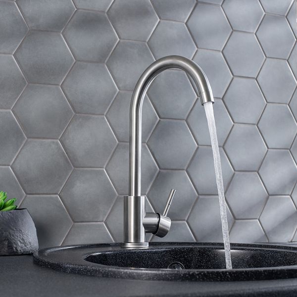 Стильный одноручковый смеситель для кухни из нержавеющей стали с высоким изливом прекрасно подойдет для мойки любого размера.