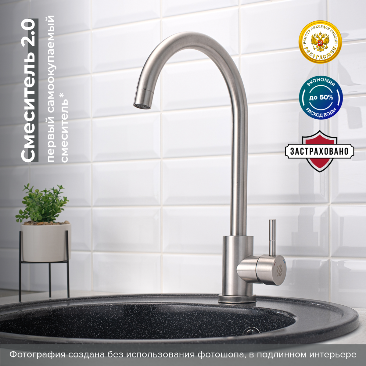Стильный одноручковый смеситель для кухни из нержавеющей стали с высоким изливом прекрасно подойдет для мойки любого размера.
