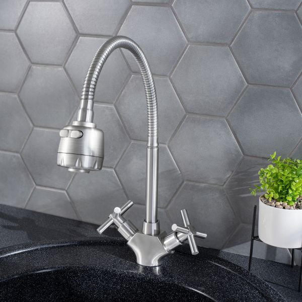 Функциональный двуручковый смеситель для кухни с гибким изливом и насадкой распылителем станет не заменимым помощником на кухне.