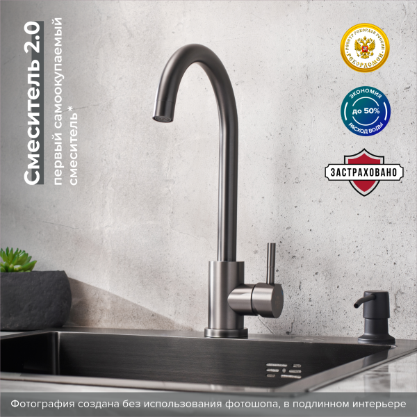 Стильный одноручковый смеситель для кухни из нержавеющей стали с высоким изливом прекрасно подойдет для мойки любого размера.