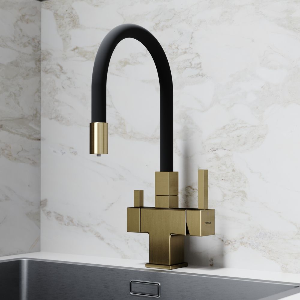 Смеситель для кухни SANCOS Arno с гибким изливом и возможностью подключения фильтра для воды, цвет брашированное золото, арт. SC4005BGФункция "Холодный старт" - при включении смесителя активируется холодной поток, для экономии горячей водыАэратор, гибкая подводка, ключ и крепления для монтажа