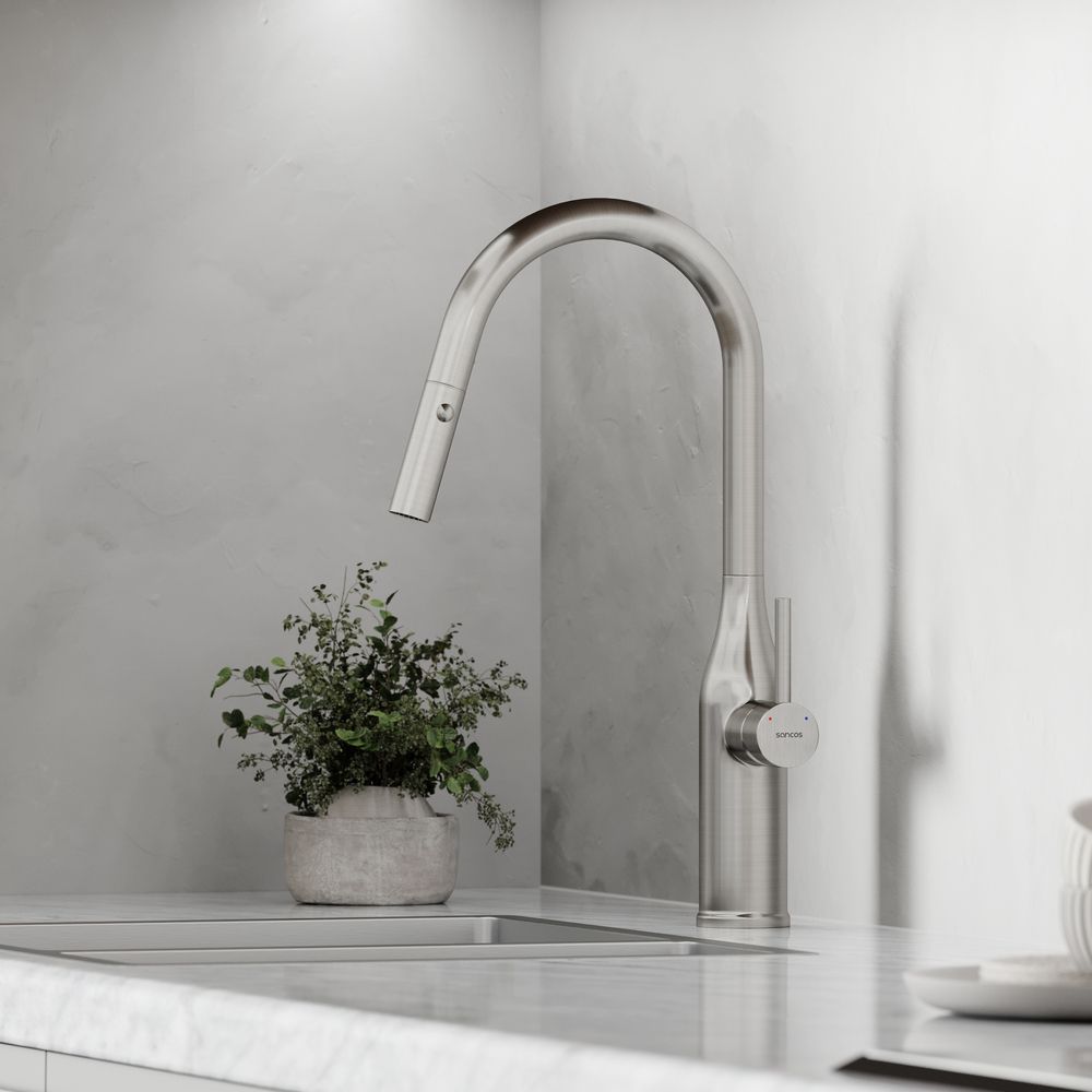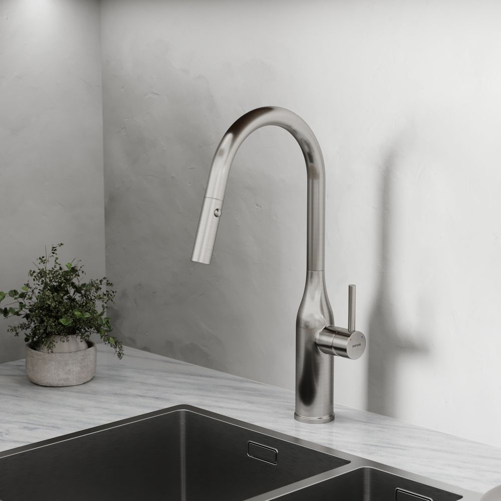 Смеситель для кухни SANCOS Grand c вытяжным и поворотным изливом, цвет нержавеющая сталь, арт. SC4002BNGС возможностью регулировки температуры водыАэратор, гибкая подводка, ключ и крепления для монтажа, ключ для обслуживания аэратора