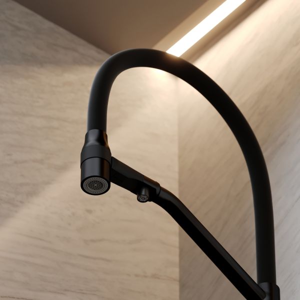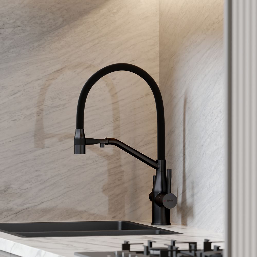 Смеситель для кухни SANCOS Orta с гибким изливом и возможностью подключения фильтра для воды, цвет матовый черный, арт. SC4008MBФункция "Холодный старт" - при включении смесителя активируется холодной поток, для экономии горячей водыАэратор, гибкая подводка, ключ и крепления для монтажа