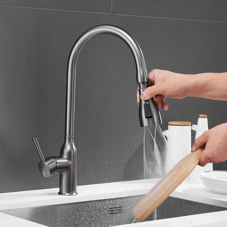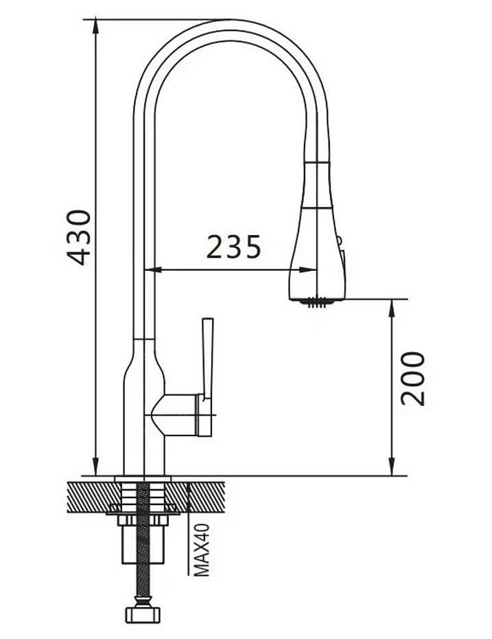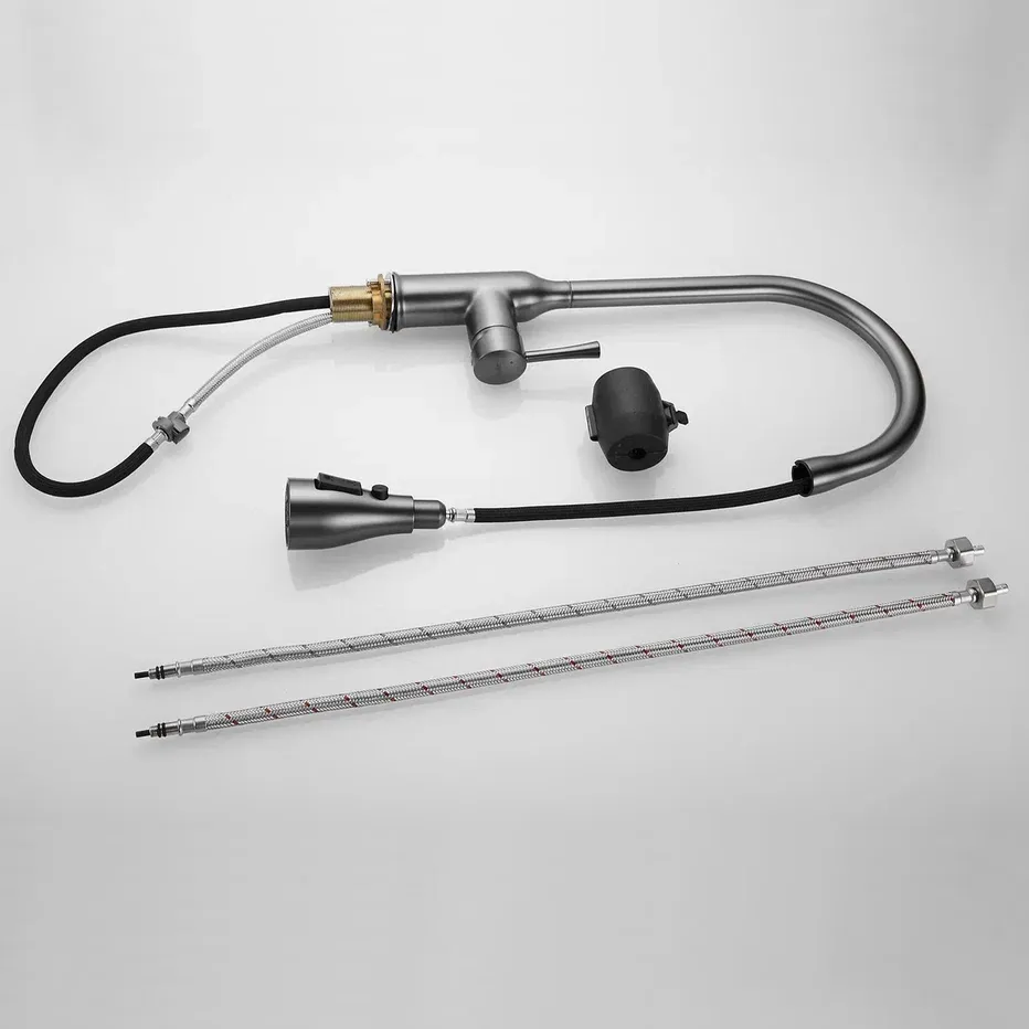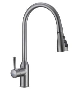 Смеситель для кухни с выдвижным изливом Shevanik S163T, оружейная сталь.Управление: рычажное.Вращение излива: да.Выдвижной излив: да.Гибкий излив: нет.Высота:43.
