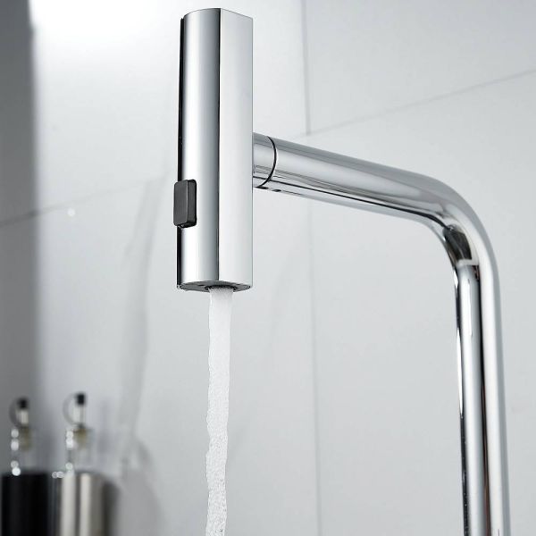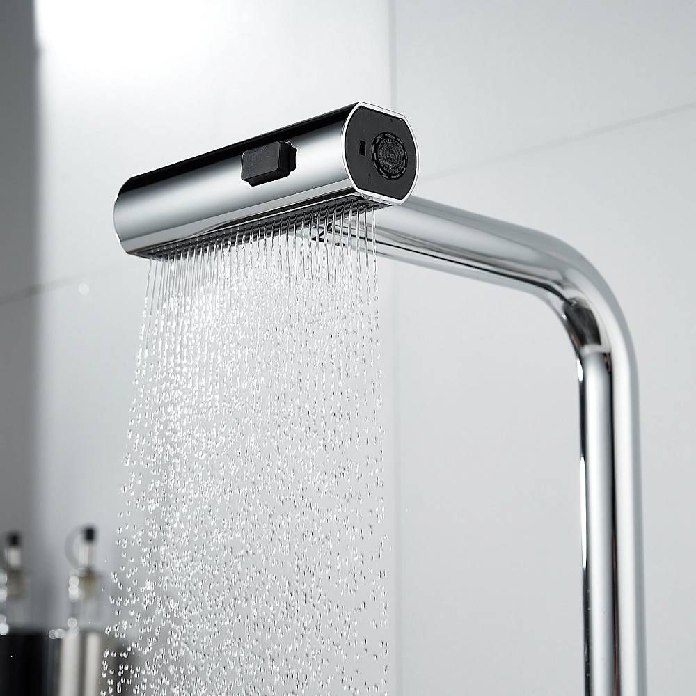 Излив предлагает 3 различных режима подачи воды: стандартный режим подходит для повседневного использования, турбо-струя идеальна для удаления сложных загрязнений, а режим широкой струи с мягким напором идеально подходит для быстрой очистки больших поверхностей, например, кухонной посуды с большим диаметром и разделочных досок.