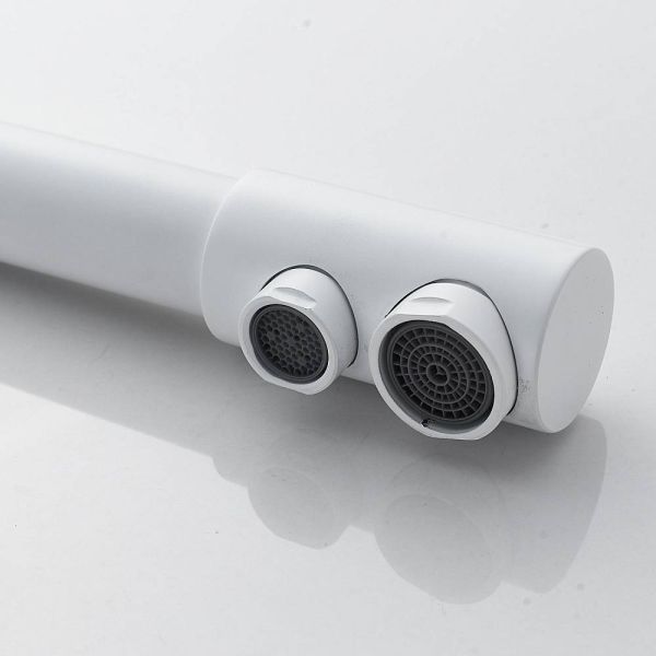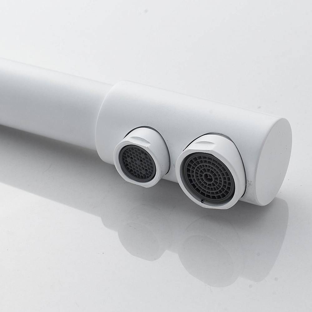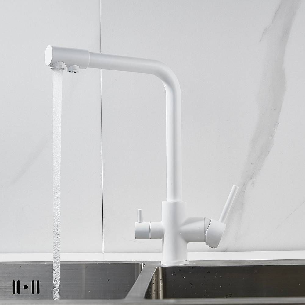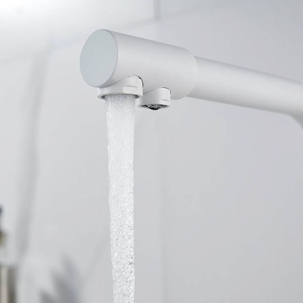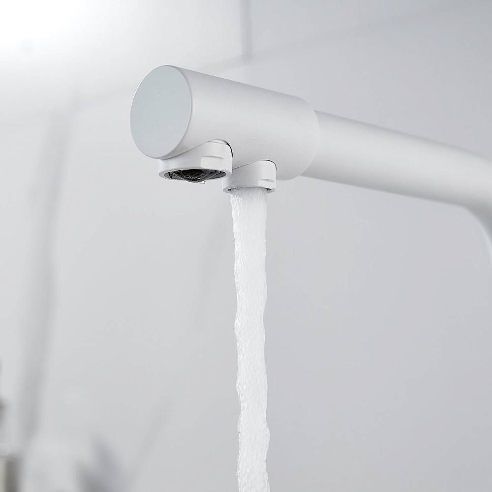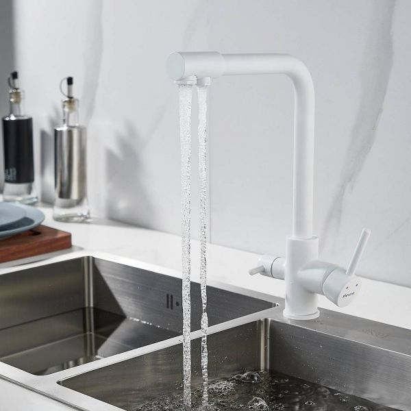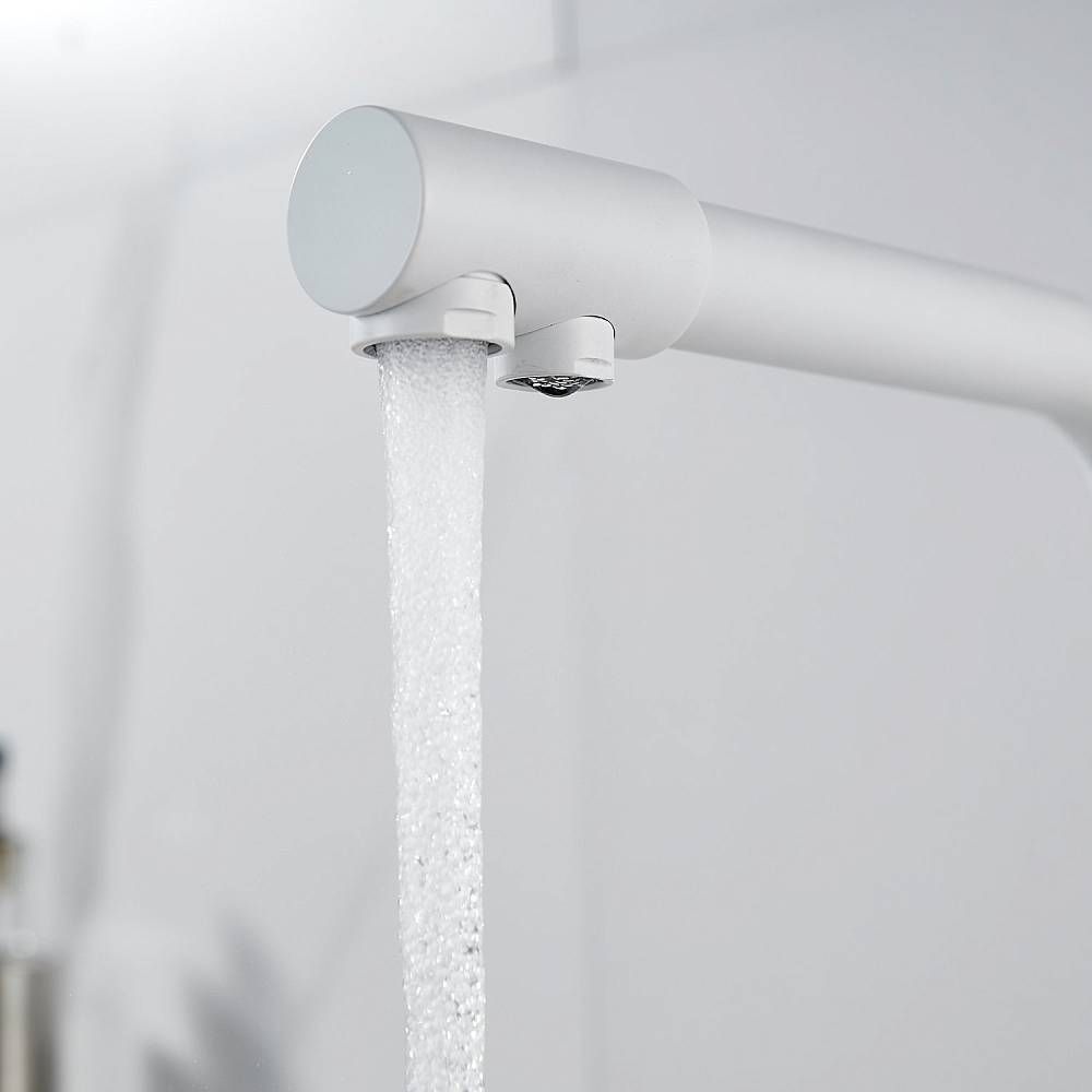 Во-первых, матовый белый цвет подойдет к любому дизайну кухни и будет гармонично смотреться в любом интерьере. Во-вторых, поворотный излив позволит легко настроить струю воды под любые ваши нужды, а встроенный канал для питьевой воды облегчит процесс фильтрации и подачи воды.