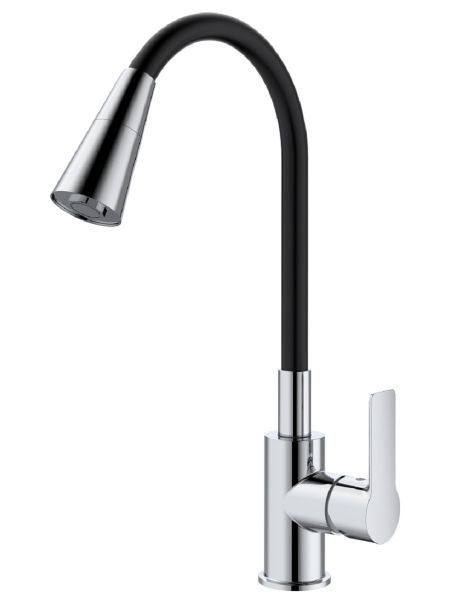 Смеситель для кухни Splenka S06.43 идеально подходит для кухонной мойки, раковины любого типа. Цвет: хром. Смеситель имеет 2 режима: поток воды и душ. Кран с гибким изливом имеет необычный внешний вид и особую конструкцию. С помощью гибкого шланга можно самостоятельно регулировать глубину выноса и высоту излива, что позволит избежать лишнего разбрызгивания воды. Также с помощью силиконового излива не составит труда добраться до всех мест в мойке, а также упрощает мытье посуды и продуктов. Стильный латунный смеситель имеет свойство шумоподавления.