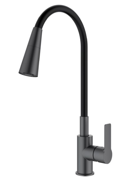 Смеситель для кухни Splenka S06.43.09 идеально подходит для кухонной мойки, раковины любого типа. Цвет: графит. Смеситель имеет 2 режима: поток воды и душ. Кран с гибким изливом имеет необычный внешний вид и особую конструкцию. С помощью гибкого шланга можно самостоятельно регулировать глубину выноса и высоту излива, что позволит избежать лишнего разбрызгивания воды. Также с помощью силиконового излива не составит труда добраться до всех мест в мойке, а также упрощает мытье посуды и продуктов. Стильный латунный смеситель имеет свойство шумоподавления.