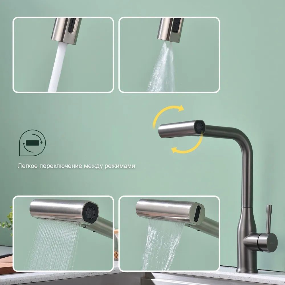 Смеситель оснащён выдвижным и поворотным изливом с режимом «душ», который позволяет выбирать между обычной струёй воды и мягкой душевой насадкой. Благодаря этому вы сможете легко и быстро настроить нужный режим в зависимости от ваших потребностей и предпочтений.