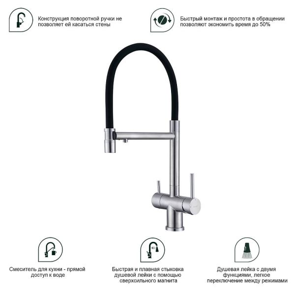 Splenka S70.63.05 Смеситель для кухни со съемным изливом на магните и подключением фильтра питьевой воды. Смесители для кухни с гибким изливом имеют необычный внешний вид и особую конструкцию. Нижняя часть представляет собой обычный однорукий латунный смеситель с регулировкой холодной и горячей воды, регулировкой напора и переключателем на фильтр с другой стороны. Верхняя часть это гибкий излив из пищевого силикона. С его помощью можно самостоятельно регулировать глубину выноса и высоту излива, что решает проблему при наполнении раковины посудой. Смеситель поворачивается на 360 градусов и оснащен отдельным выходом для фильтрованной воды. Переключение на воду из фильтра осуществляется переключателем с керамическим картриджем.
