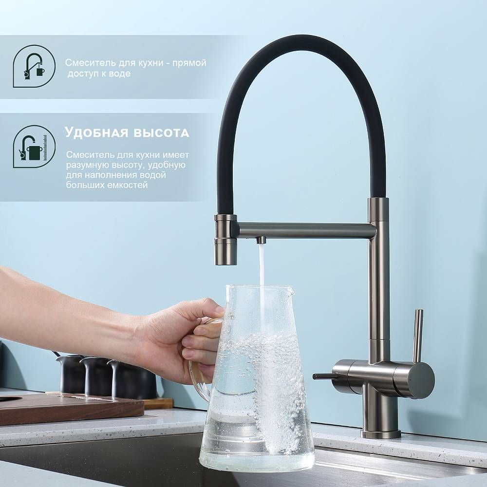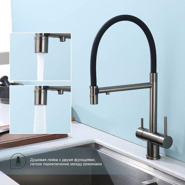 Splenka S70.63.09 Смеситель для кухни со съемным изливом на магните и подключением фильтра питьевой воды. Смесители для кухни с гибким изливом имеют необычный внешний вид и особую конструкцию. Нижняя часть представляет собой обычный однорукий латунный смеситель с регулировкой холодной и горячей воды, регулировкой напора и переключателем на фильтр с другой стороны. Верхняя часть это гибкий излив из пищевого силикона. С его помощью можно самостоятельно регулировать глубину выноса и высоту излива, что решает проблему при наполнении раковины посудой. Смеситель поворачивается на 360 градусов и оснащен отдельным выходом для фильтрованной воды. Переключение на воду из фильтра осуществляется переключателем с керамическим картриджем.