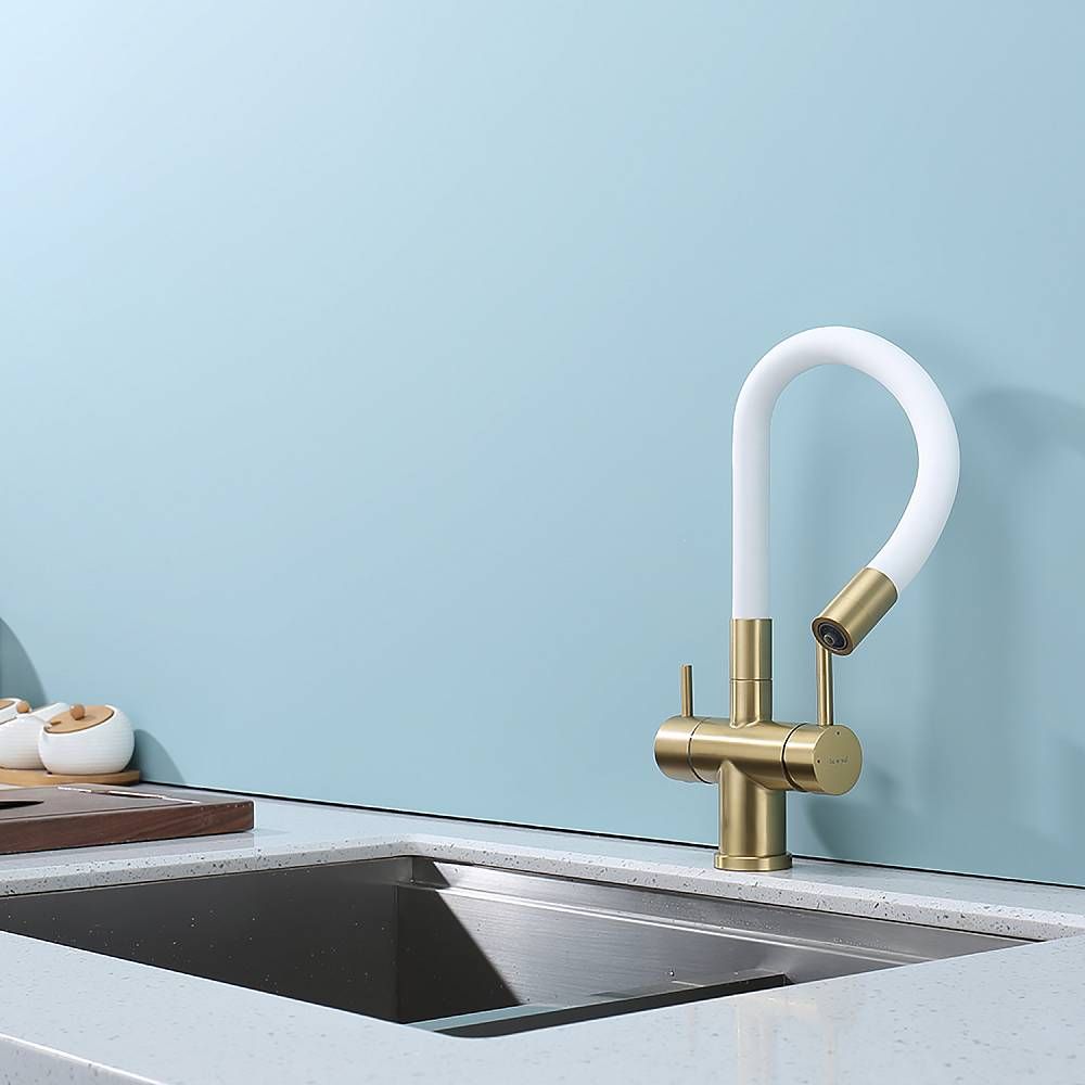 Смеситель для кухни с подключением к фильтру питьевой воды Splenka S70.64.03. Цвет: сатин золотой. Гибкая подводка 50 см идет в комплекте. Благодаря грамотно разработанной конструкции, прибор отлично справляется с регулированием температуры и напора потоков воды. Однорычажные смесители максимально удобны при эксплуатации, всего одним движением руки можно закрыть или открыть воду, имеют стильный внешний вид, а также комфортность в использовании. Гарантия 5 лет.