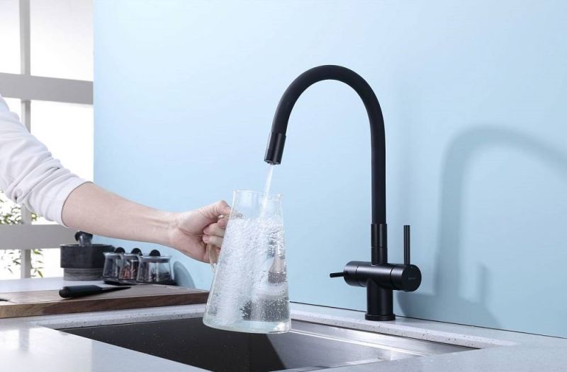 Смеситель для кухни с подключением к фильтру питьевой воды Splenka S70.64.06. Цвет: черный. Гибкая подводка 50 см идет в комплекте. Благодаря грамотно разработанной конструкции, прибор отлично справляется с регулированием температуры и напора потоков воды. Однорычажные смесители максимально удобны при эксплуатации, всего одним движением руки можно закрыть или открыть воду, имеют стильный внешний вид, а также комфортность в использовании. Гарантия 5 лет.