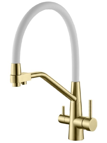 Смеситель для кухни с подключением к фильтру питьевой воды Splenka S71.62.03. Цвет: сатин золотой. Гибкая подводка 50 см идет в комплекте. Благодаря грамотно разработанной конструкции, прибор отлично справляется с регулированием температуры и напора потоков воды. Однорычажные смесители максимально удобны при эксплуатации, всего одним движением руки можно закрыть или открыть воду, имеют стильный внешний вид, а также комфортность в использовании. Гарантия 5 лет.