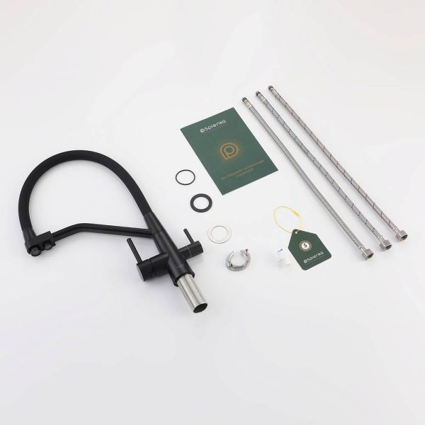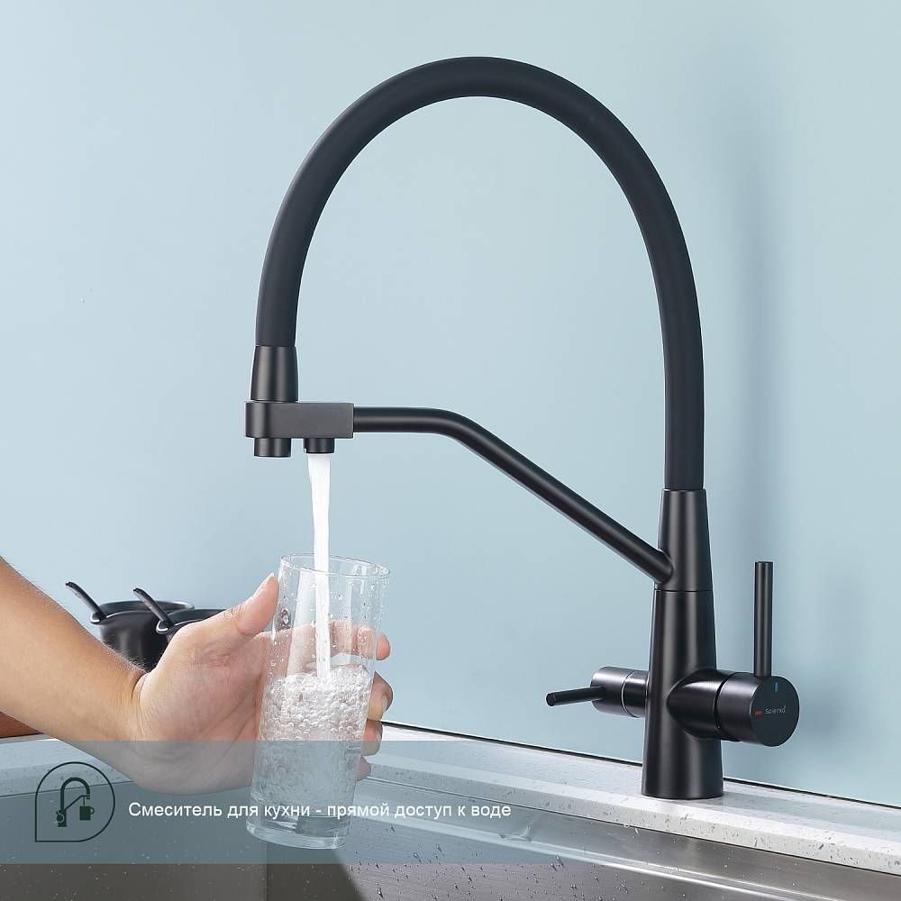 Смеситель для кухни с подключением к фильтру питьевой воды Splenka S71.62.06. Цвет: черный. Гибкая подводка 50 см идет в комплекте. Благодаря грамотно разработанной конструкции, прибор отлично справляется с регулированием температуры и напора потоков воды. Однорычажные смесители максимально удобны при эксплуатации, всего одним движением руки можно закрыть или открыть воду, имеют стильный внешний вид, а также комфортность в использовании. Гарантия 5 лет.